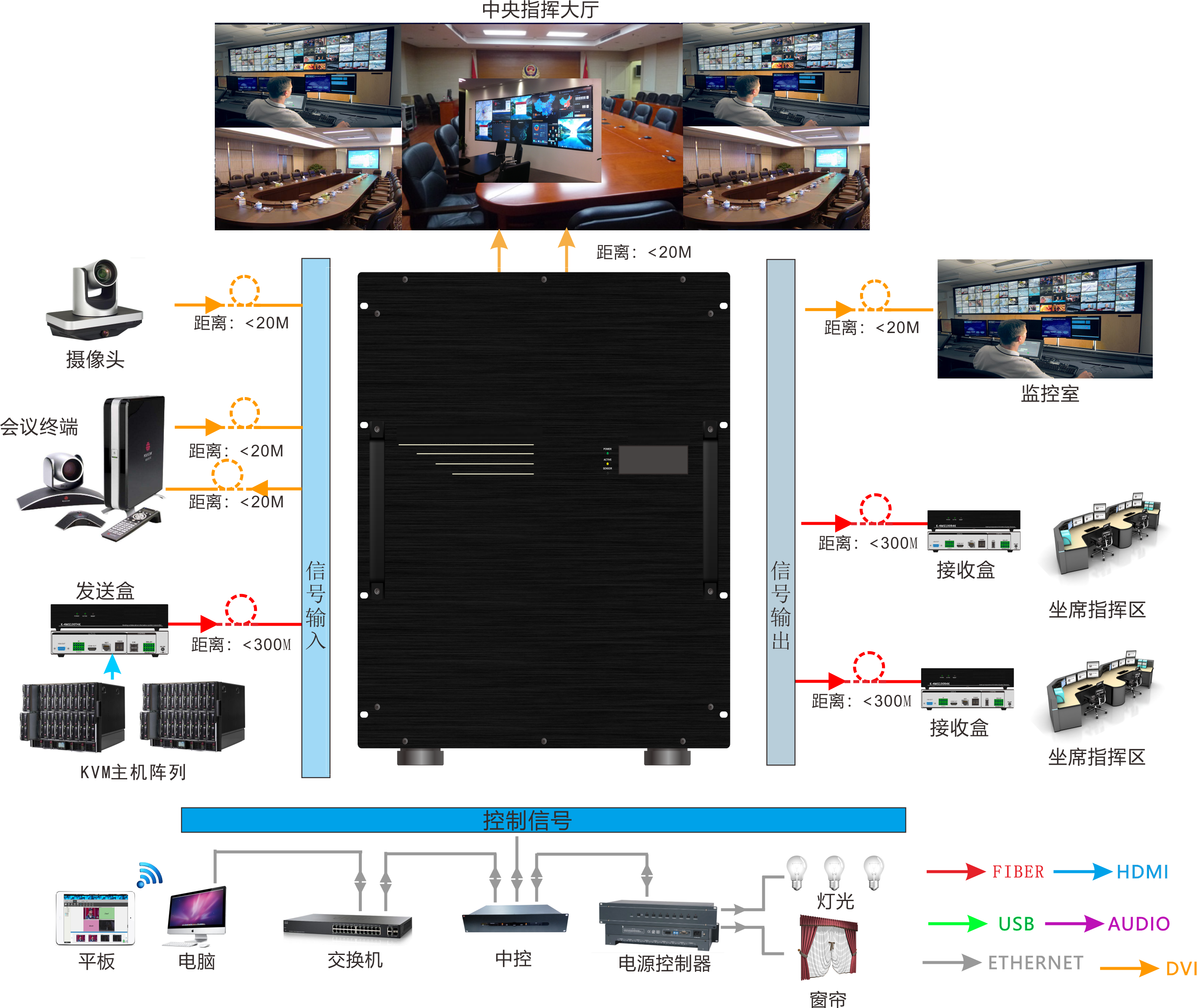 圖像處理器提供大幅面高分辨率的圖形顯示環(huán)境,使活動(dòng)視頻、RGB信號(hào)窗口等各種類型的圖像信號(hào)以及全息超高分辨率的應(yīng)用圖像均可以在顯示拼墻上完美重現(xiàn)。本方案設(shè)計(jì)為提供48路RGB\DVI信號(hào)輸出,28路RGB\DVI信號(hào)輸入,12路復(fù)合視頻信號(hào)源輸入。