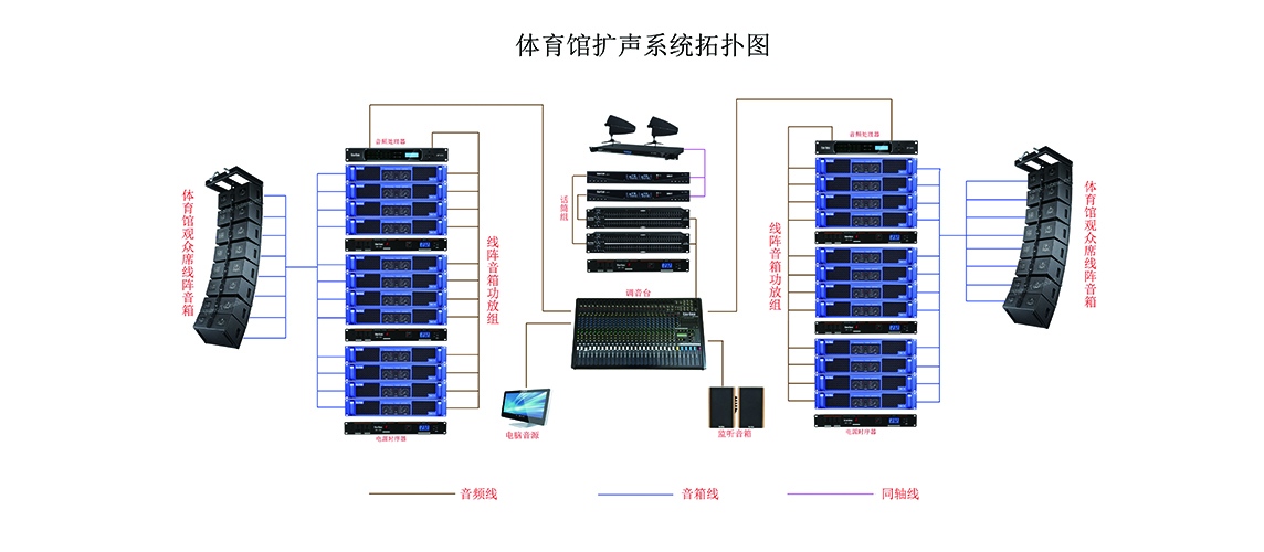 場地?cái)U(kuò)聲采用分散擴(kuò)聲式布置,觀眾席的分布采用集中擴(kuò)聲式布置,主席臺(tái)采用流動(dòng)的擴(kuò)聲方式。擴(kuò)聲系統(tǒng)的設(shè)備主要分為六部份:擴(kuò)聲設(shè)備、處理設(shè)備、功放設(shè)備、調(diào)音臺(tái)設(shè)備、周邊處理器及音源設(shè)備和信號(hào)拾取設(shè)備。這六個(gè)部份互相配合而成,確保在使用時(shí)效果理想,操控容易,減低出錯(cuò)機(jī)會(huì),且能在極短的設(shè)定時(shí)間內(nèi)便能應(yīng)付任何變化的需要。