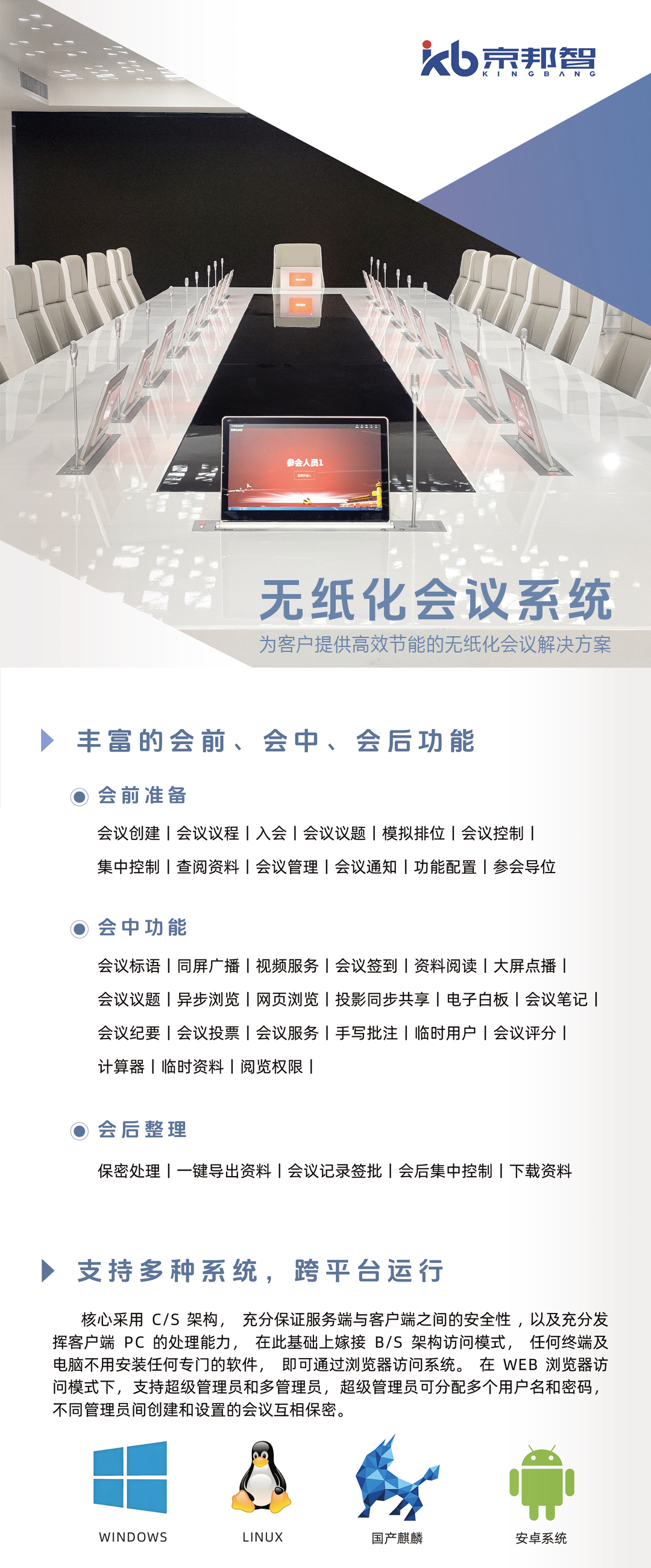 無(wú)紙化會(huì)議系統(tǒng)可以無(wú)縫對(duì)接數(shù)字會(huì)議系統(tǒng)、業(yè)務(wù)系統(tǒng)、辦公OA系統(tǒng)、中控系統(tǒng)、云會(huì)議預(yù)約系統(tǒng)、庭審系統(tǒng)、綜合管理平臺(tái)等,實(shí)現(xiàn)統(tǒng)一管控,互聯(lián)互通。無(wú)紙化會(huì)議系統(tǒng)具有高度保密、電子存檔、穩(wěn)定可靠等特性,提供會(huì)前準(zhǔn)備、會(huì)中功能、會(huì)后整理等多種高效功能,如會(huì)議討論、投票表決、會(huì)議紀(jì)要、文件共享、文件會(huì)簽、會(huì)議服務(wù)等。在顯示終端方面,各種尺寸以及類型均可自由選擇,滿足各種場(chǎng)景需求。